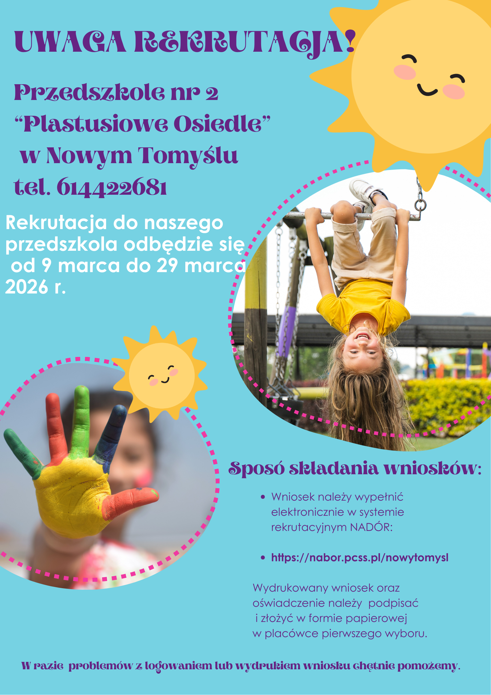 28 sierpnia 2024 r. od 10:00 do 12:00 w Przedszkolu nr 2 „Plastusiowe Osiedle” odbędzie się Dzień Otwarty dla wszystkich nowo przyjętych wychowanków.